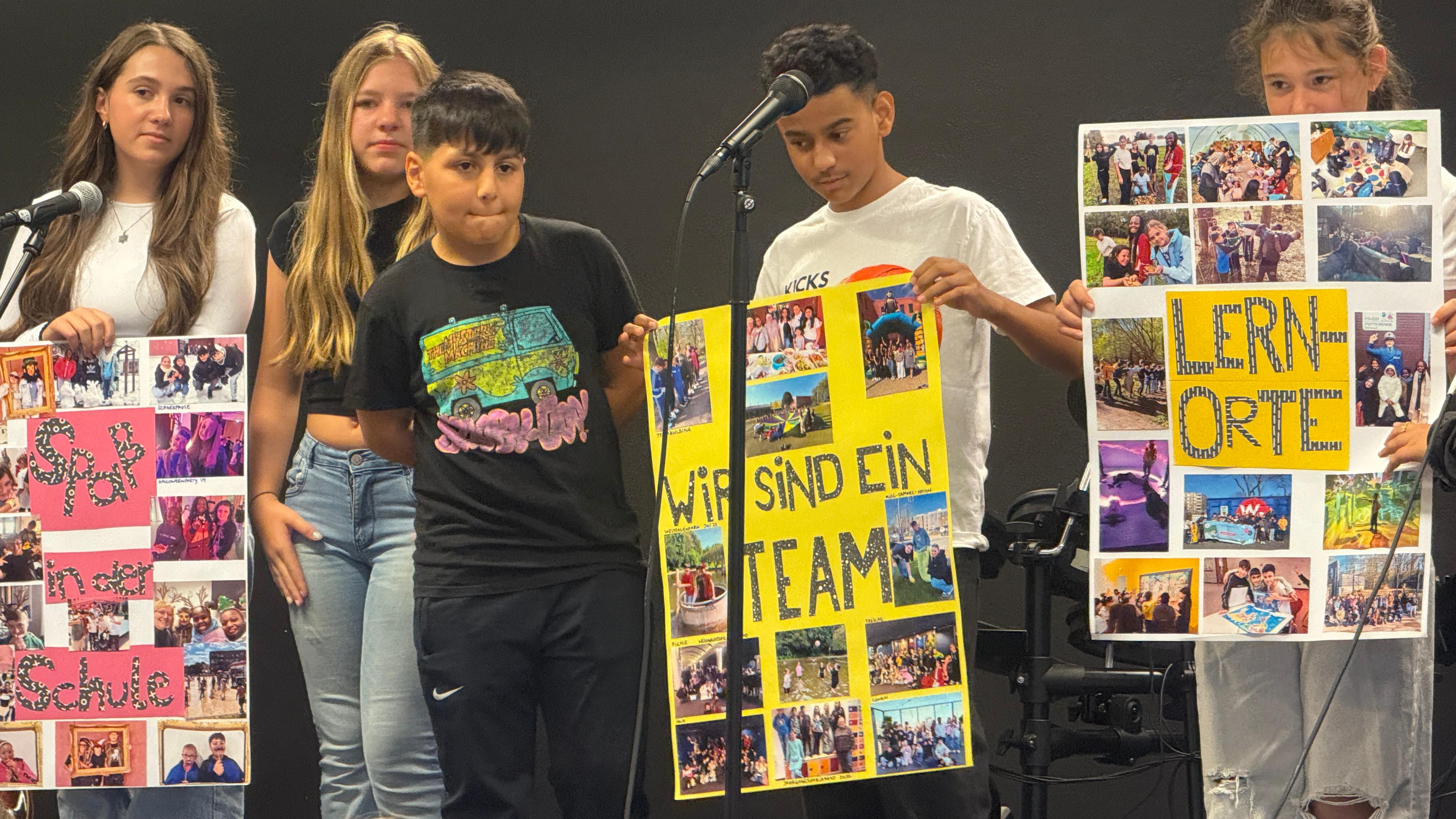 Eine Klasse hieß die Kinder in den Sprachen ihrer Herkunftsländer willkommen – darunter Deutschland, Türkei, Ghana, Kamerun, Irak, Nordmazedonien und viele weitere.